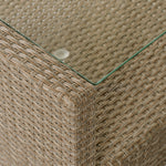 - Constructed with thick, weather-resistant rattan weaving in a timeless beige color, this set is built to withstand the elements and resist wear and tear.