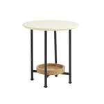 - With its sleek design, this white and natural wood end table features black metal legs for a modern touch.