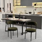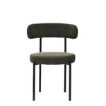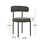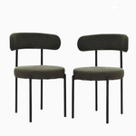 - This set of 2 Mid-Century Modern Boucle Dining Chairs is made with a green velvet fabric cushion and black metal spray-painted legs.