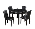 - Accompanied by four upholstered dining chairs made with solid wood and high-quality foam padding, this set guarantees a comfortable and enjoyable dining experience.