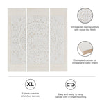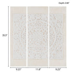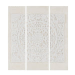 • Each piece showcases an intricately carved design in durable resin, attached to an off-white washed canvas with a distressed finish for a rustic touch.